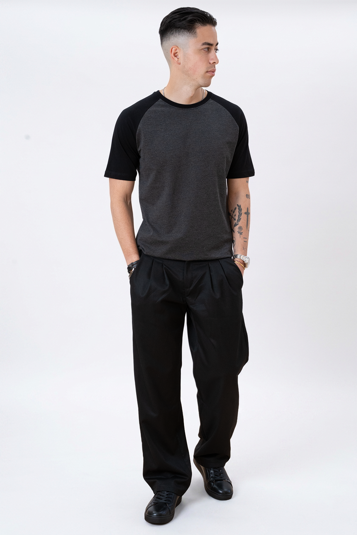 Verhoog uw dagelijkse garderobe met onze Basic Raglan t-shirt In zwart-donker grijs, een veelzijdig stuk dat moeiteloos stijl en comfort biedt. Gemaakt van premium Materialen en ontworpen met een moderne draai, dit T-shirt is perfect voor het toevoegen van een vleugje verfijning aan elk ensemble. Laten we onderzoeken wat ons zwart-donkere grijs maakt Basic Raglan t-shirt een must-have toevoeging aan je verzameling.