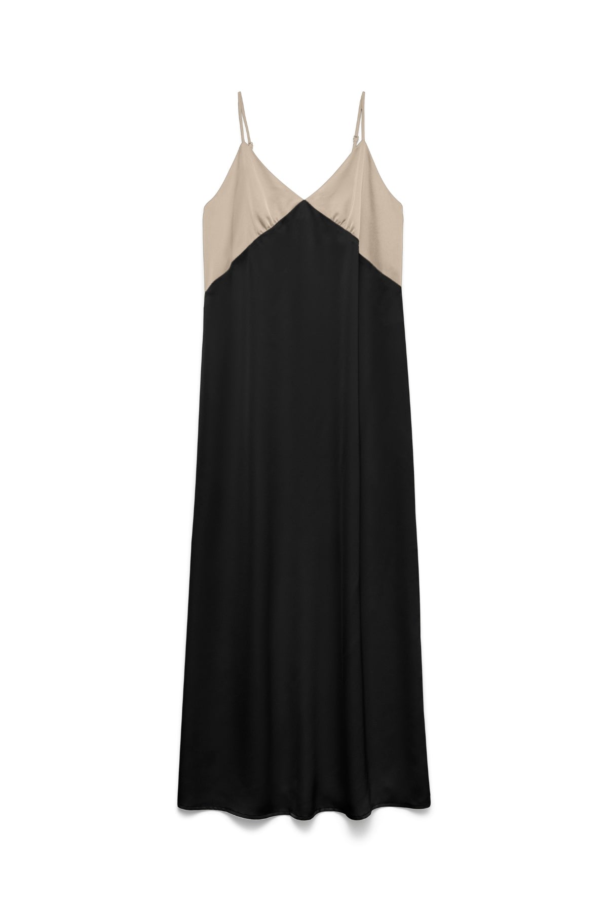 Het singlet-ontwerp is voorzien van delicate maar stevige bandjes die zorgen voor een moderne en strakke uitstraling, zodat je je favoriete sieraden kunt laten zien. Deze jurk is ontworpen om te ademen, waardoor het een ideale keuze is voor buitenevenementen waar je koel wilt blijven en er onberispelijk gekleed uit wilt zien. Het contrast is geïnspireerd op stedelijke architectuur, waardoor een vleugje city-chique aan uw persoonlijke collectie wordt toegevoegd. Het is een stuk dat naadloos overgaat van een dagsetting naar een laat diner en belichaamt de flexibiliteit die de moderne vrouw van haar garderobe verlangt.